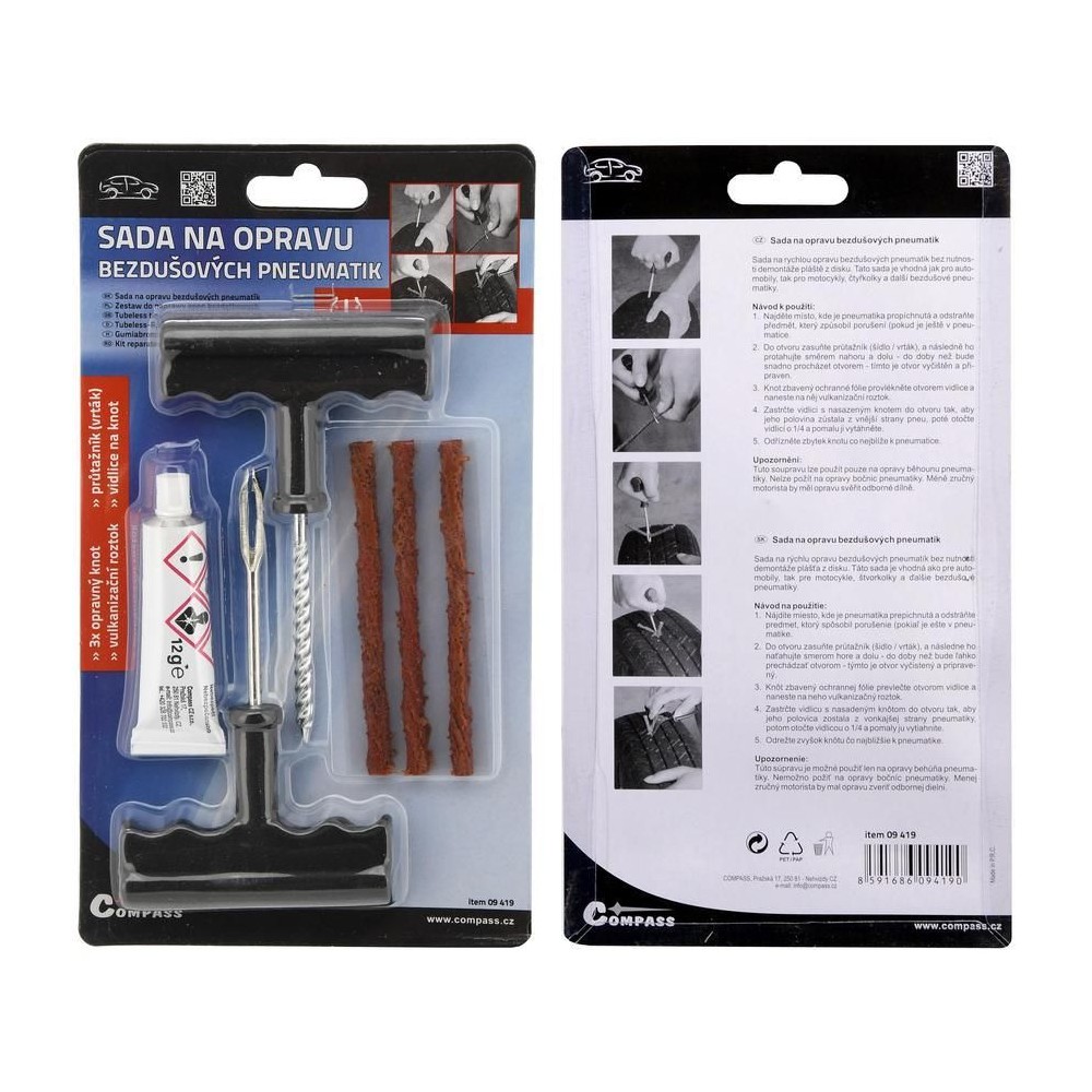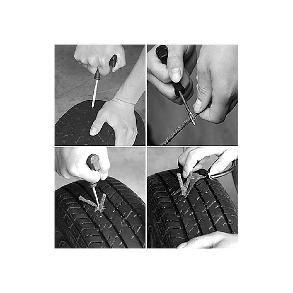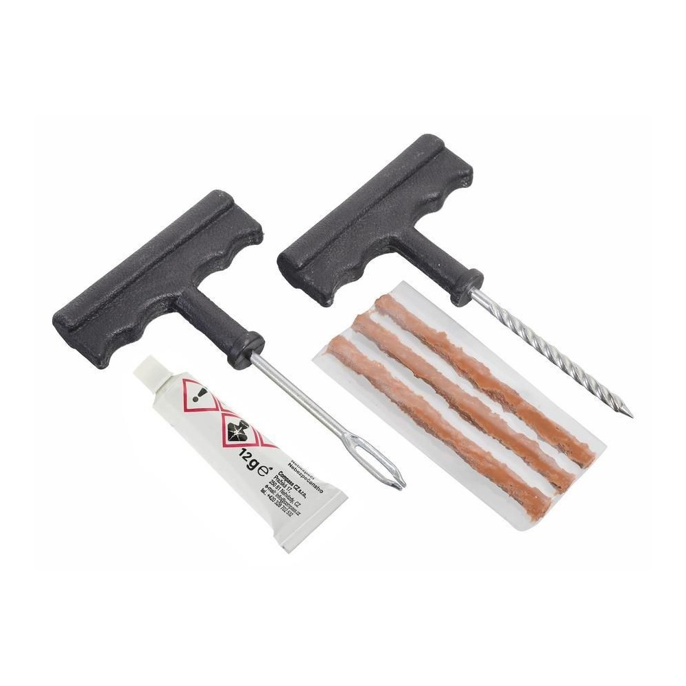 Sada na rychlou opravu bezdušových pneumatik bez nutnosti demontáže pláště z disku. Tato sada je vhodná jak pro automobily, tak pro motocykly, čtyřkolky a další bezdušové pneumatiky.