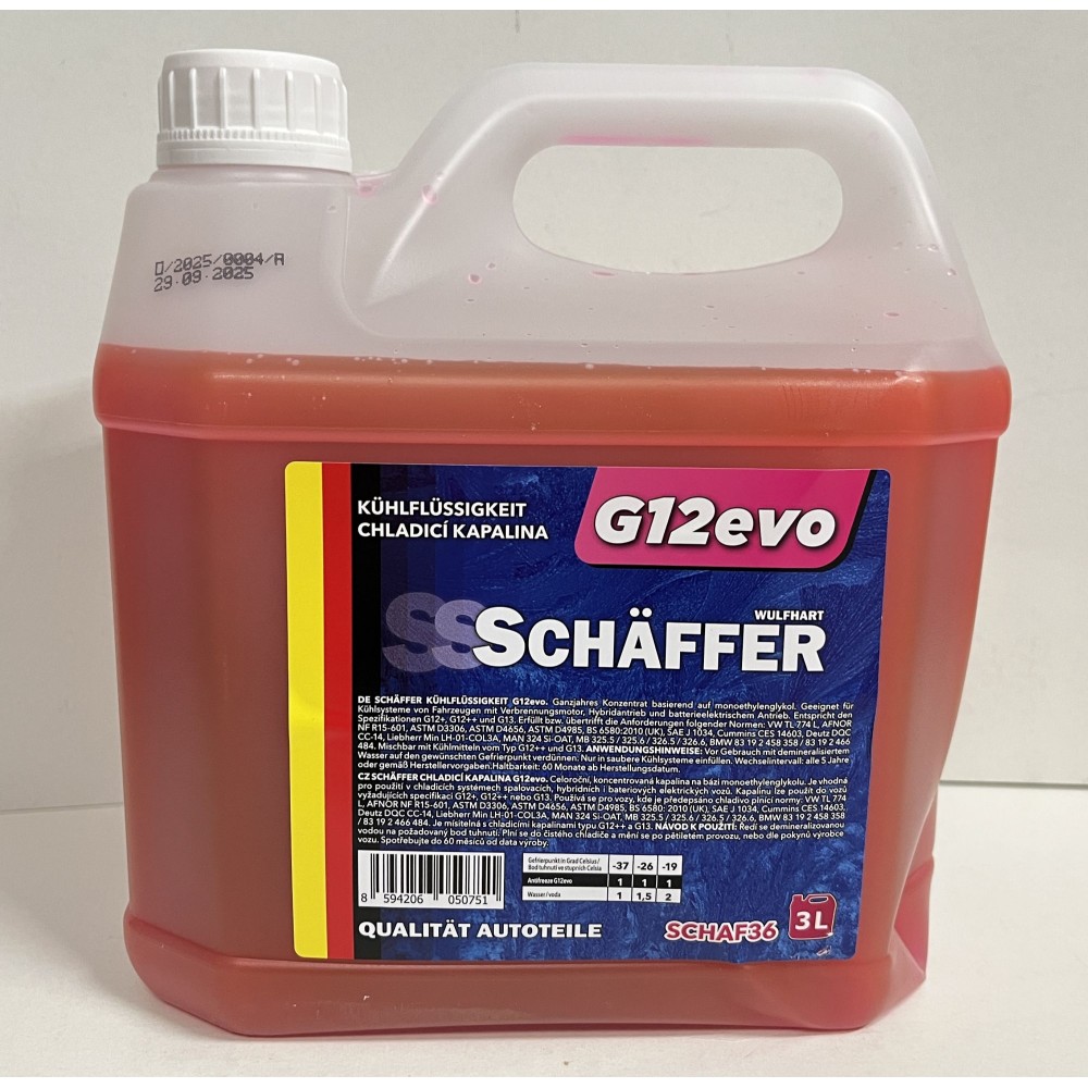 Antifreeze G12 Evo je růžová nejmodernější a nejuniverzálnější multifunkční chladicí kapalina pro spalovací motory (ICE), hybridní vozy a nepřímé chladicí systémy bateriových elektrických vozidel (BEV) s prodlouženou výměnou lhůtou 5 let. Kapalina na bázi monoethylenglykolu a špičkových silikátových, fosfátových a organických (Si-OAT) aditiv. Chladicí kapalina Antifreeze G12 Evo splňující specifikaci VW TL-774 L (G12evo) je svými parametry schopna nahradit chladicí kapaliny předchozích specifikací VW TL-774 C/D/F/G/J (G11, G12, G12+/++, G13). Jedná se o koncentrovanou chladicí kapalinu, proto je vždy nutné naředit na požadovanou hodnotu dle tabulky uvedené na obalu.
